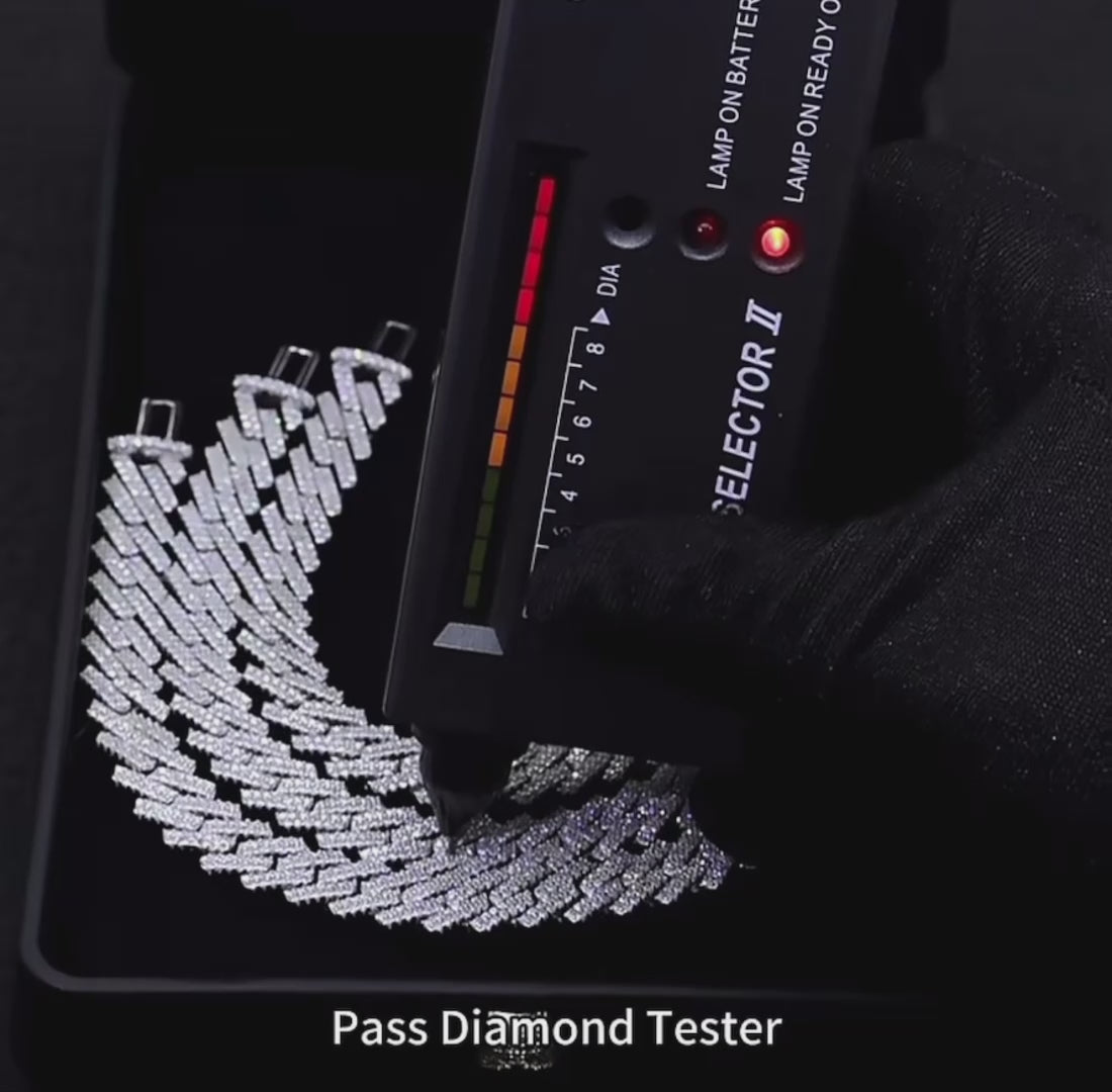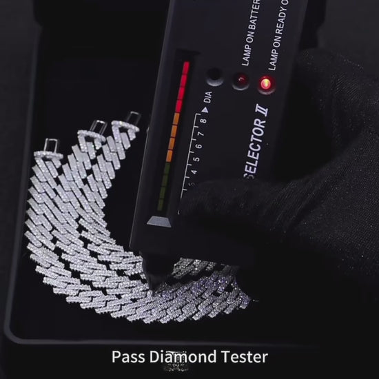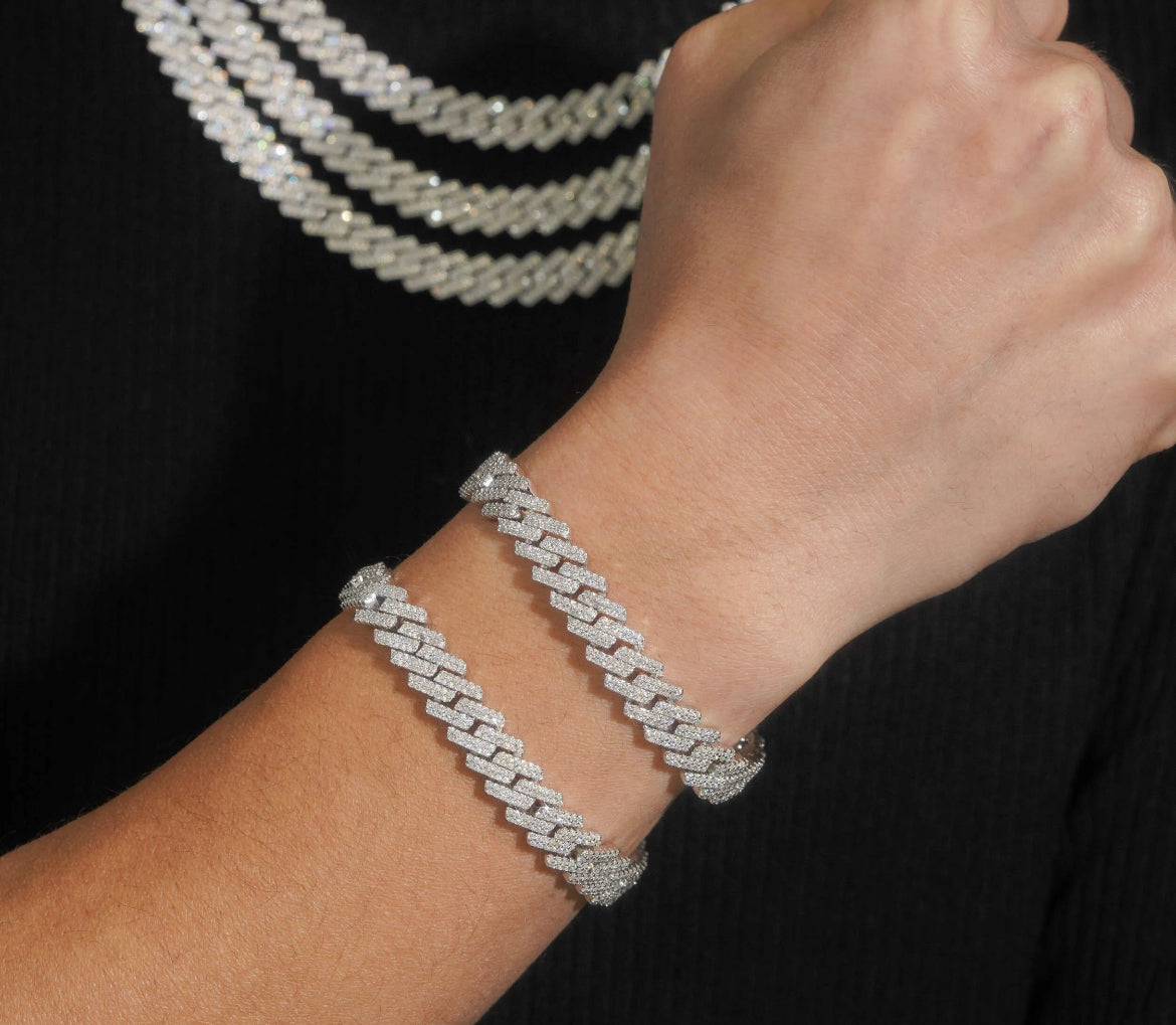 This Miami Cuban has links with exquisite round-cut moissanite stones, meticulously set in a two-row prong arrangement. Made from premium 925 silver, each stone on this Cuban chain boasts VVS1 clarity and D color, arranged on a 10mm wide structure.