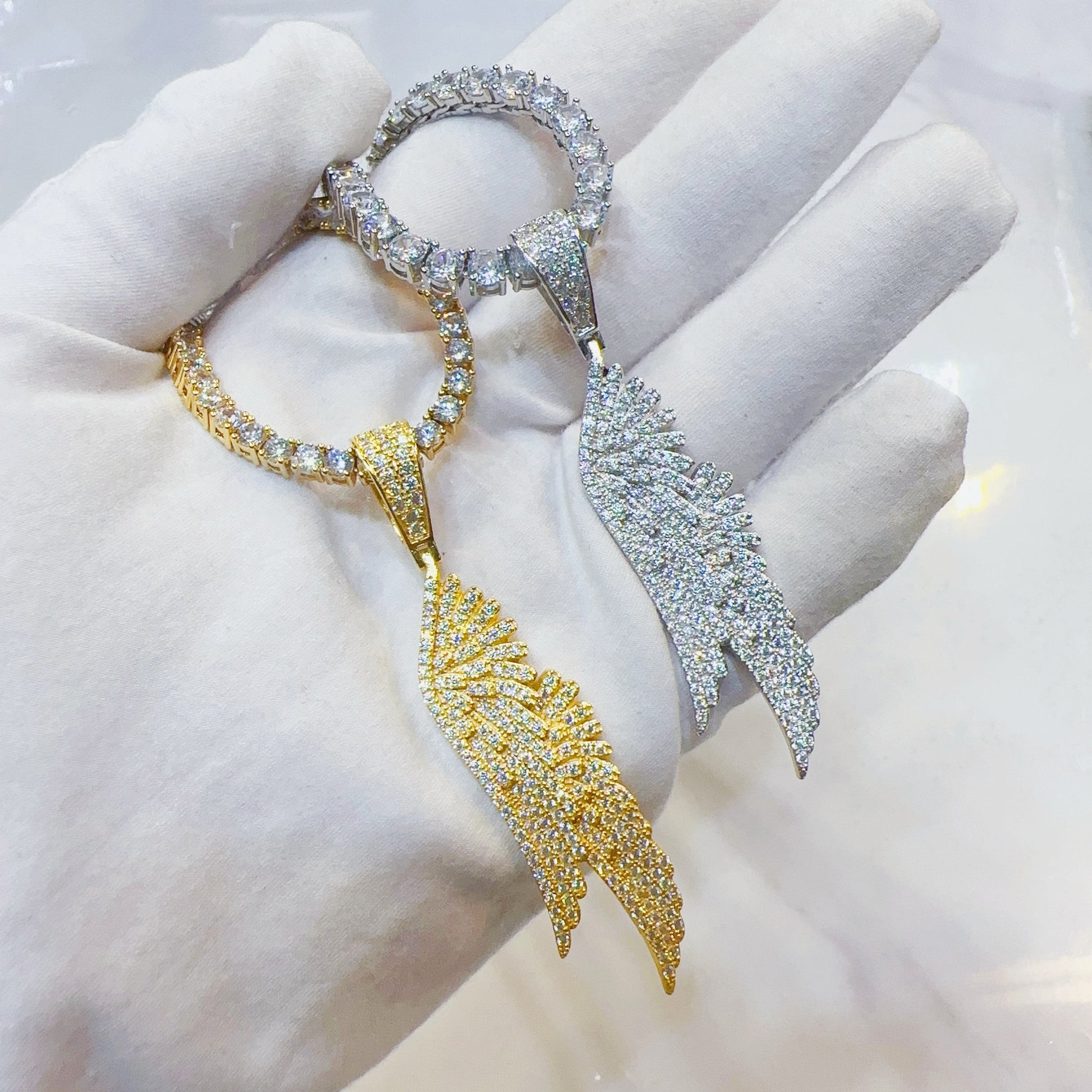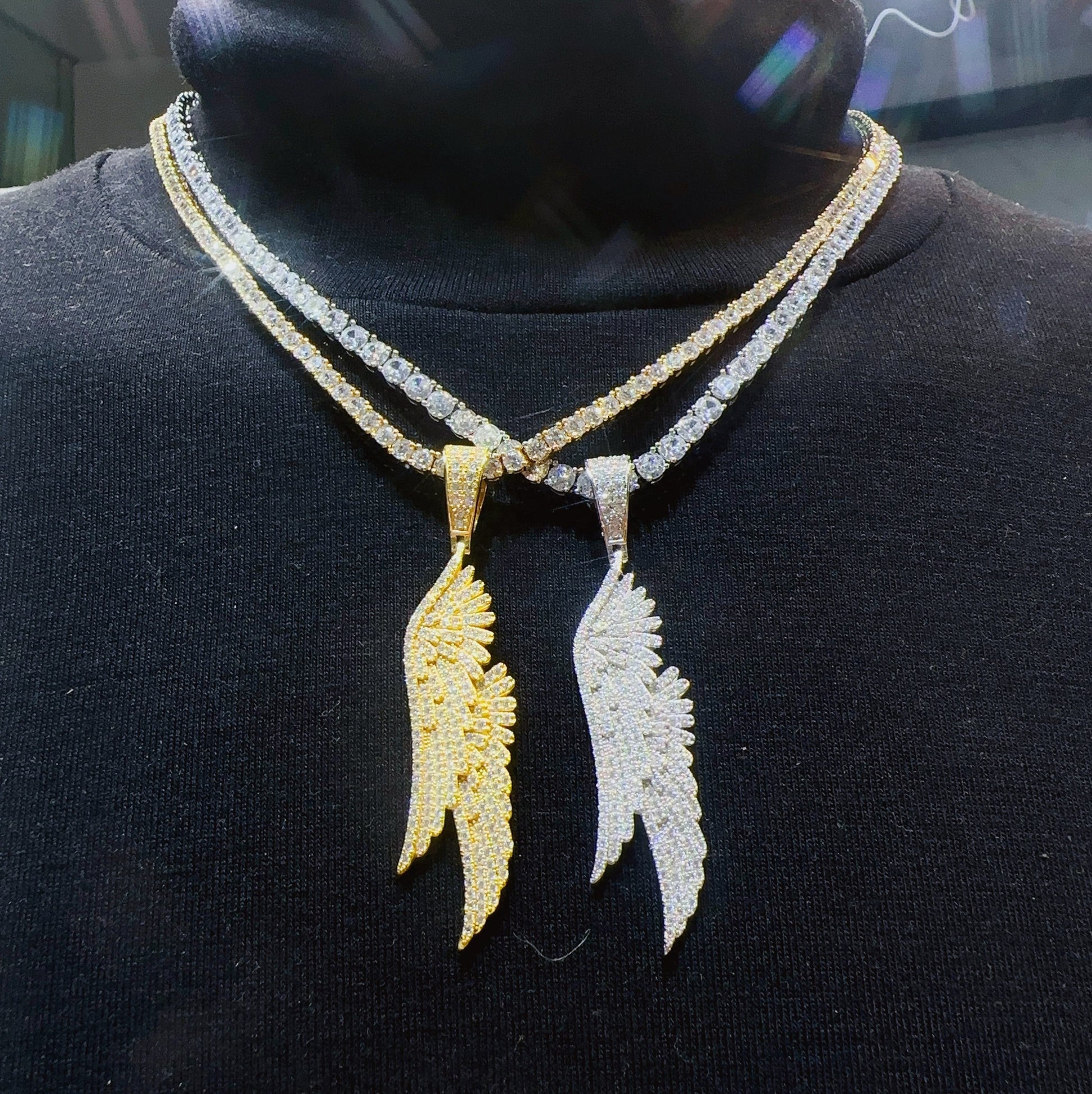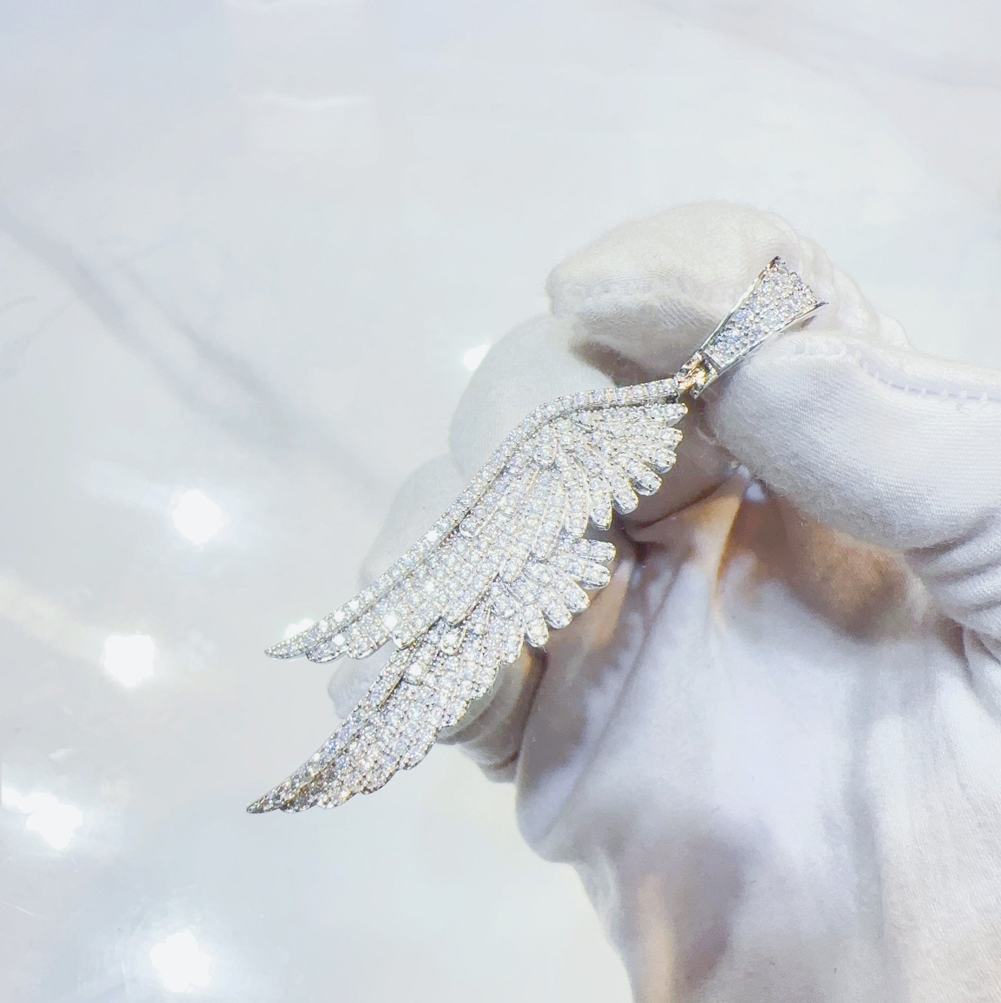 A sharp, well-cut angel wing pendant made from solid 925 sterling silver and set with high-clarity D/VVS moissanite. The design is well built, balanced, and clean. It hits with a bright, consistent shine and sits well on any tennis or rope chain. Available in silver or gold-plated vermeil finishes.