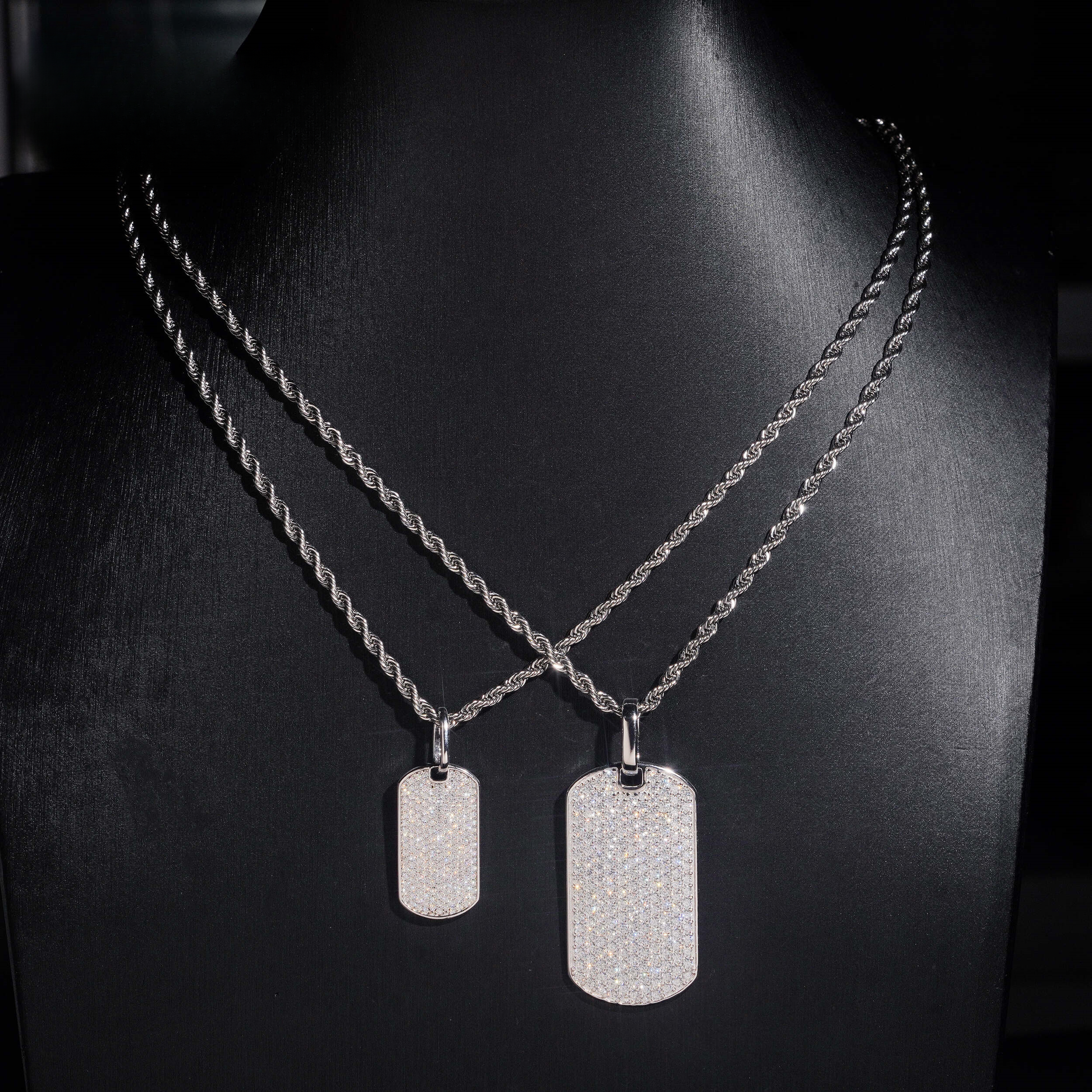 This iced dog tag pendant is built from solid 925 silver and set with tight-packed VVS moissanite for a clean, even shine. The flat face gives it a sleek look, while the stones hit hard in direct light. Available in two sizes and easy to pair with any rope or tennis chain.
